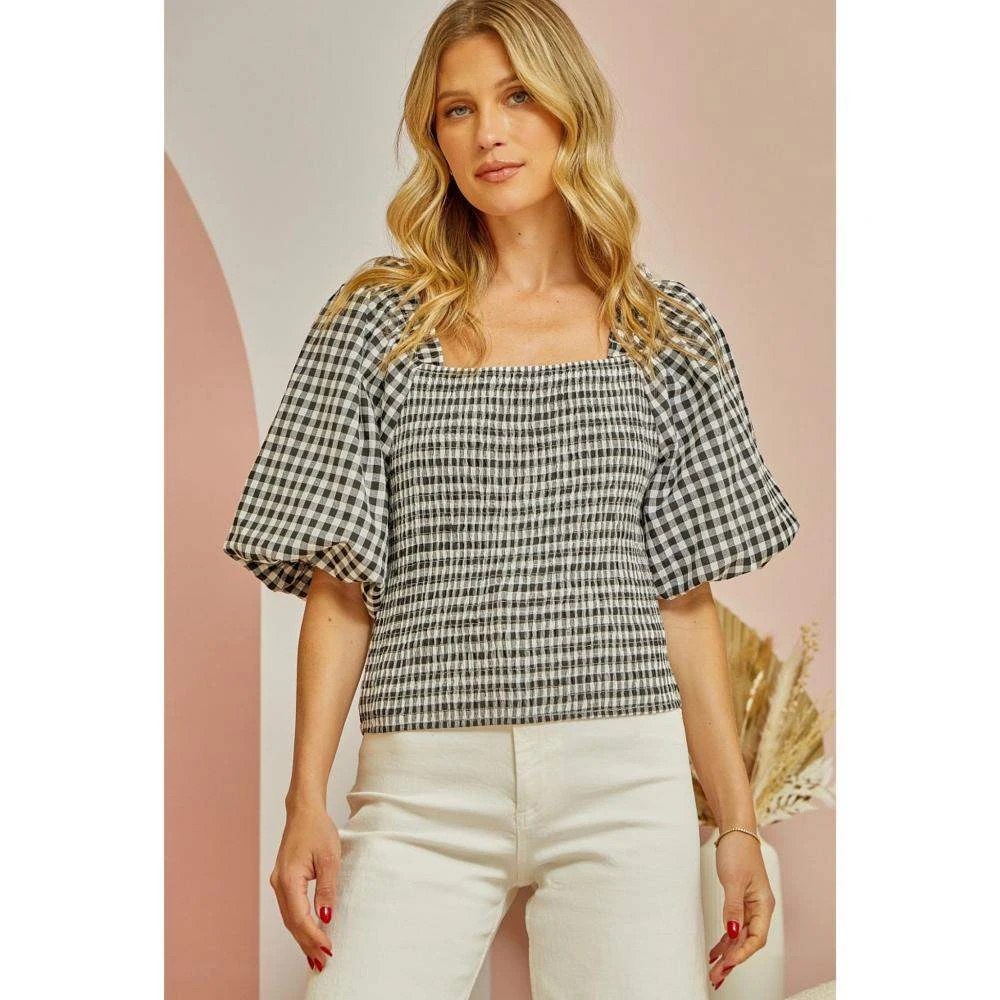 This Gingham print top features a square neckline with puff sleeves. Bodice is smocked all the way around. Non-sheer.