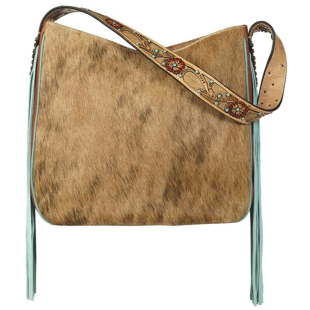The Ariat Lorelei shoulder bag features aqua fringe on sides with leather accents for a western look.