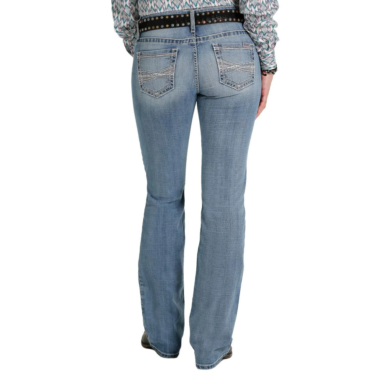A great summer go-to has arrived. The HANNAH boot cut boasts a light stonewashed 10.9 oz. cross-hatch stretch denim with heavy hand sanding, whiskers, chevrons, tacking and knee starbursts. White and gray wave inspired embroidery lines the back pockets, yoke and front pocket scoops.