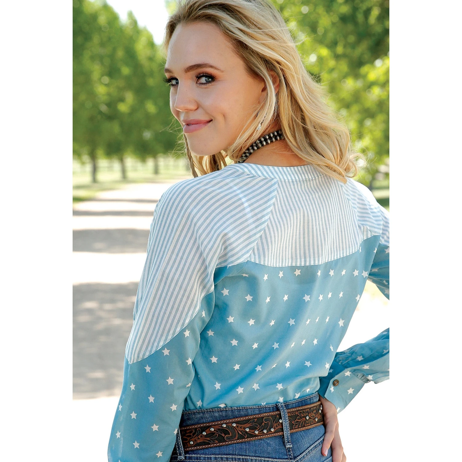 Our classic ladies button down is reimagined as a feminine blouse with special detail and a bit of attitude! Blue and white cotton plain weave construction features a unique stars and stripes print, mandarin collar, contrast piecing and metal buttons.