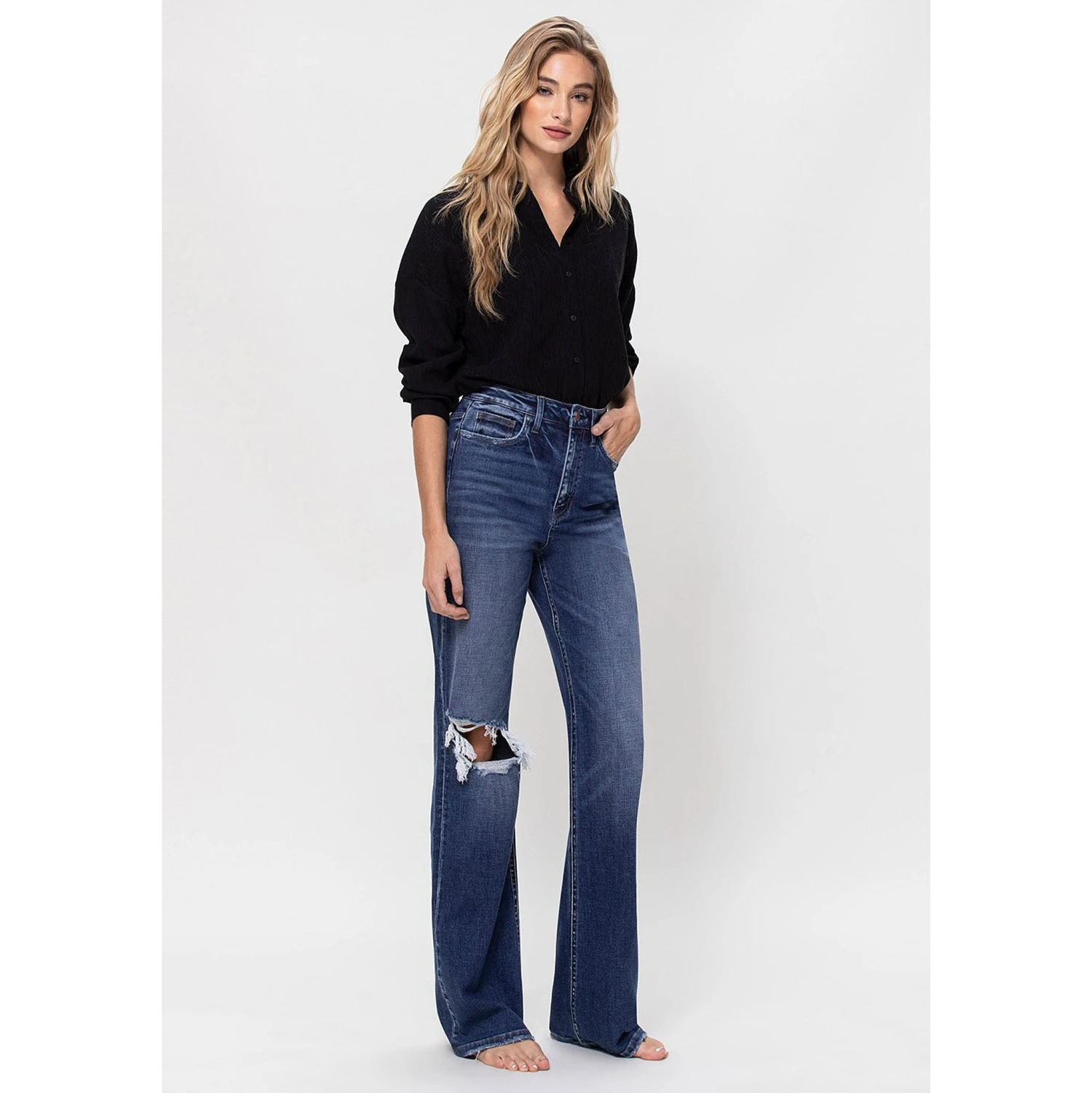 Kind of Blue jeans are a comfortable stretchy denim with a high waist and distressed knee. These will give you that throw back look with comfort.