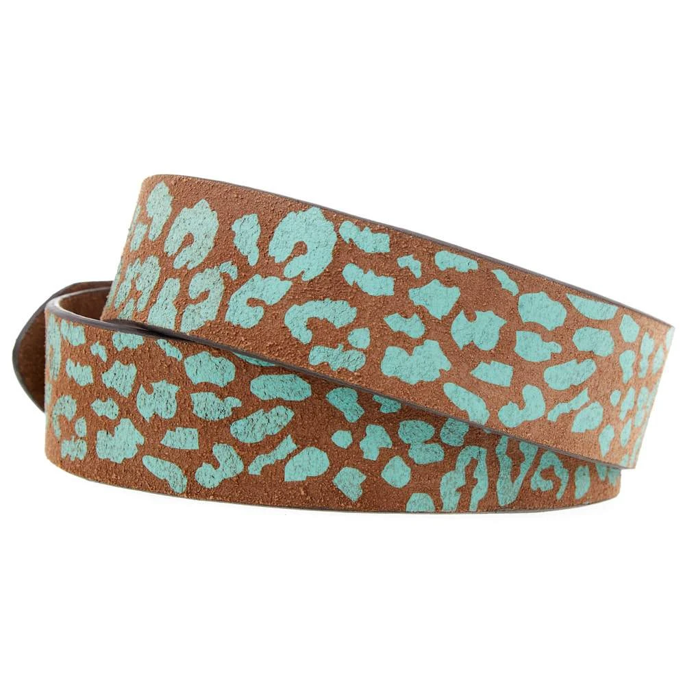 Genuine Leather belt with Leopard screen print on Vintage suede leather, slight burnished edges, and buckle in silver finish.