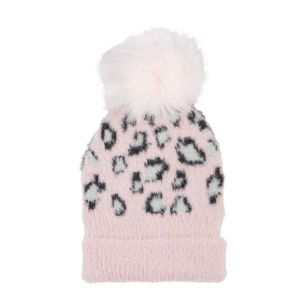 Help your little one get warm this winter with our Pink Fuzzy Leopard Toddler Hat. The fuzzy leopard knit hat has a faux fur pom. The beanie features a pink background with a black and white leopard print pattern. The beanie features a pink cuff detail. This makes a great Christmas gift.