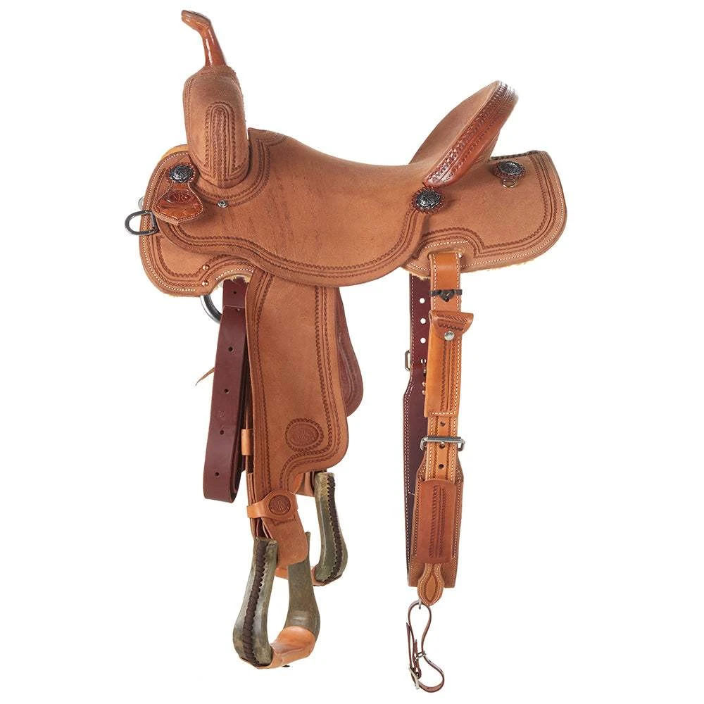This NRS Competitor Series Barrel Racer has a 5 year warranty on the rawhide covered wood tree, rawhide stirrups, roughout, natural leather, front in skirt rigging, a hard seat and 90/10 wool blend lining. The seat pocket is constructed to help hold the rider in place and offer better balance effectively giving the rider every advantage.