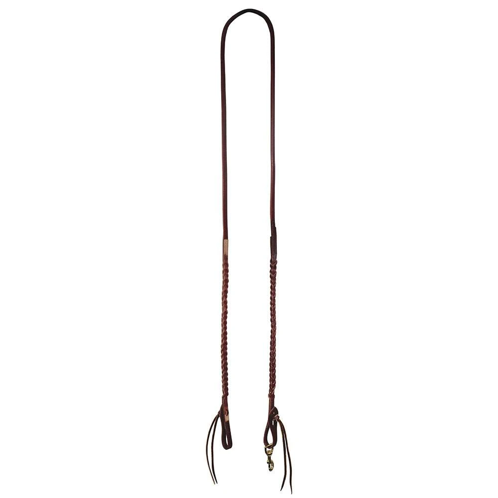 Unique “bleeding heart” double plaited front 5/8in roping rein with solid brass snaps. 7’9″ to 8′.