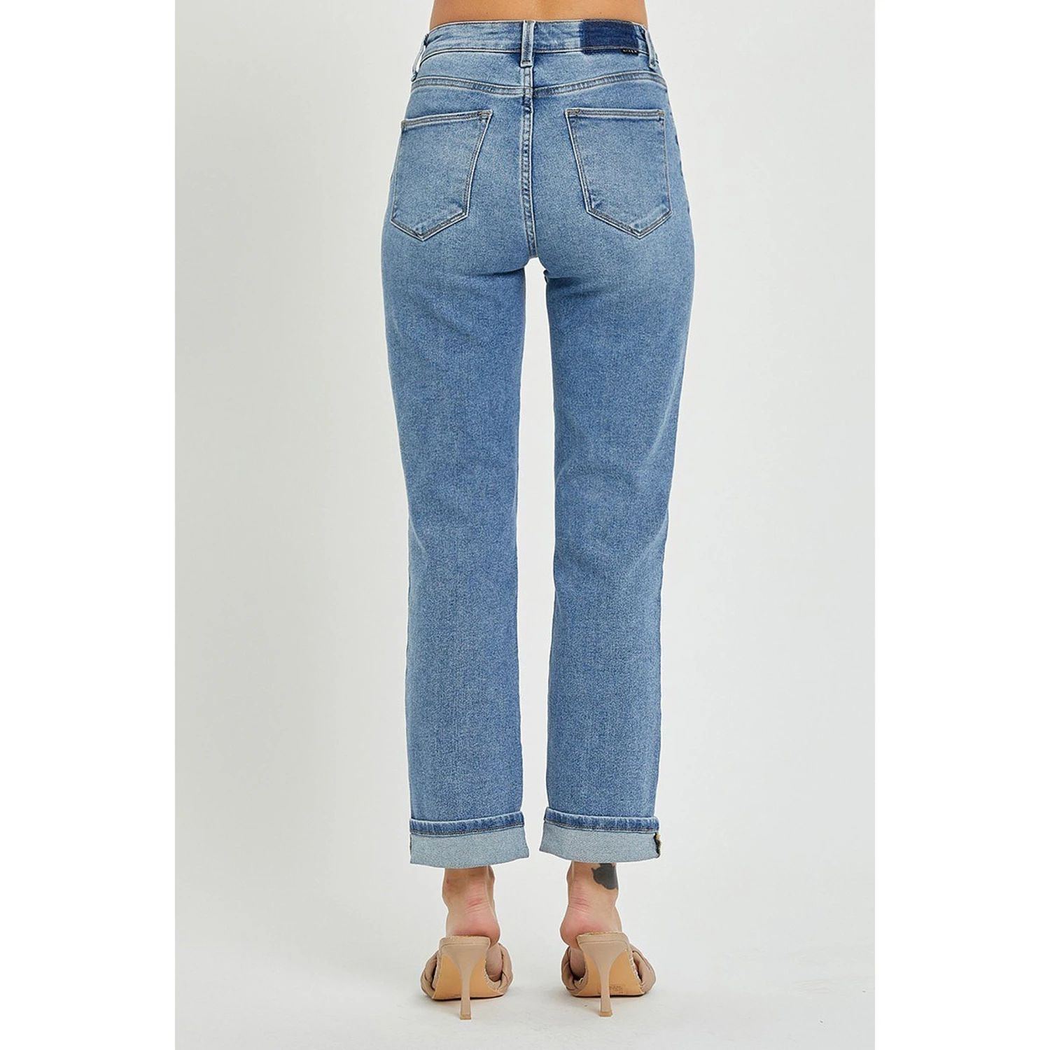 They are so trendy with medium wash cross over high rise jeans.