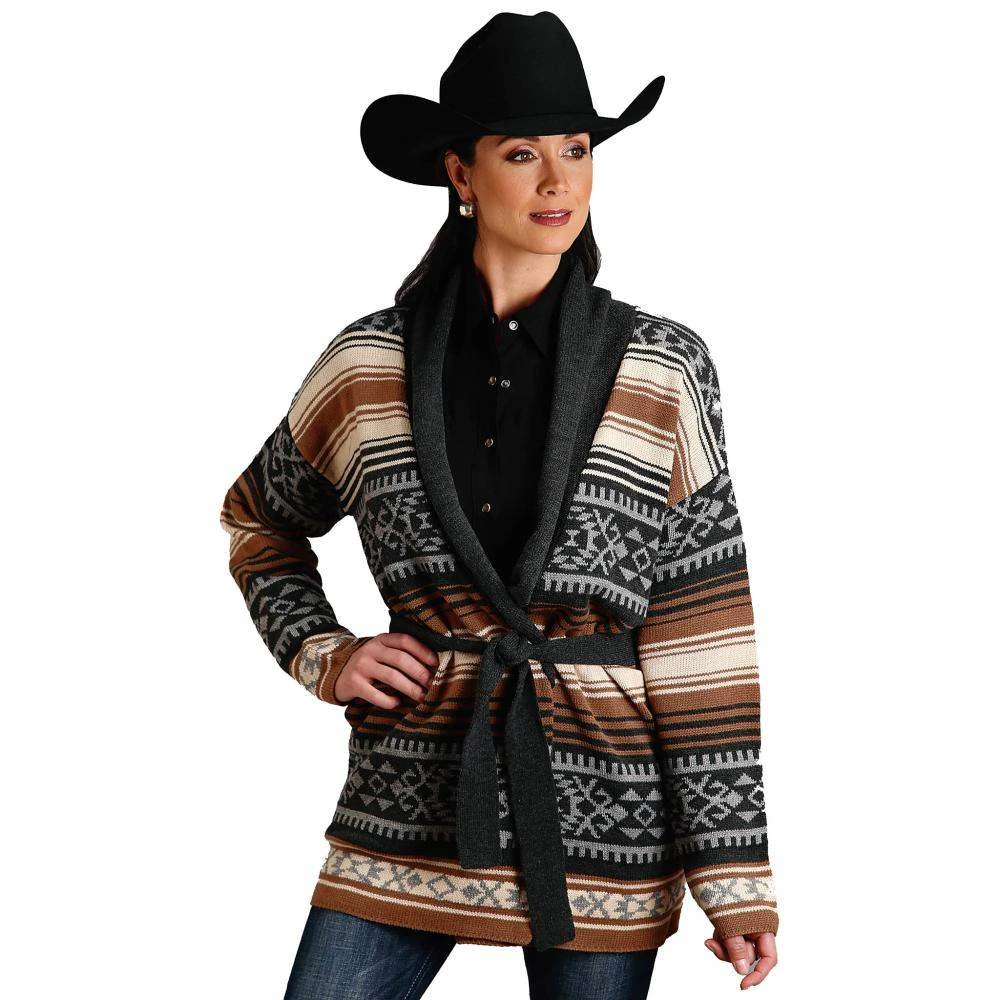 Featuring a rich brown serape inspired pattern, this belted shawl collar cardigan sweater features drop shoulders, side seam pockets and a self tie waist. Made from a cozy wool blend, it has a flowing, easy drape that pairs perfectly over your favorite jeans.